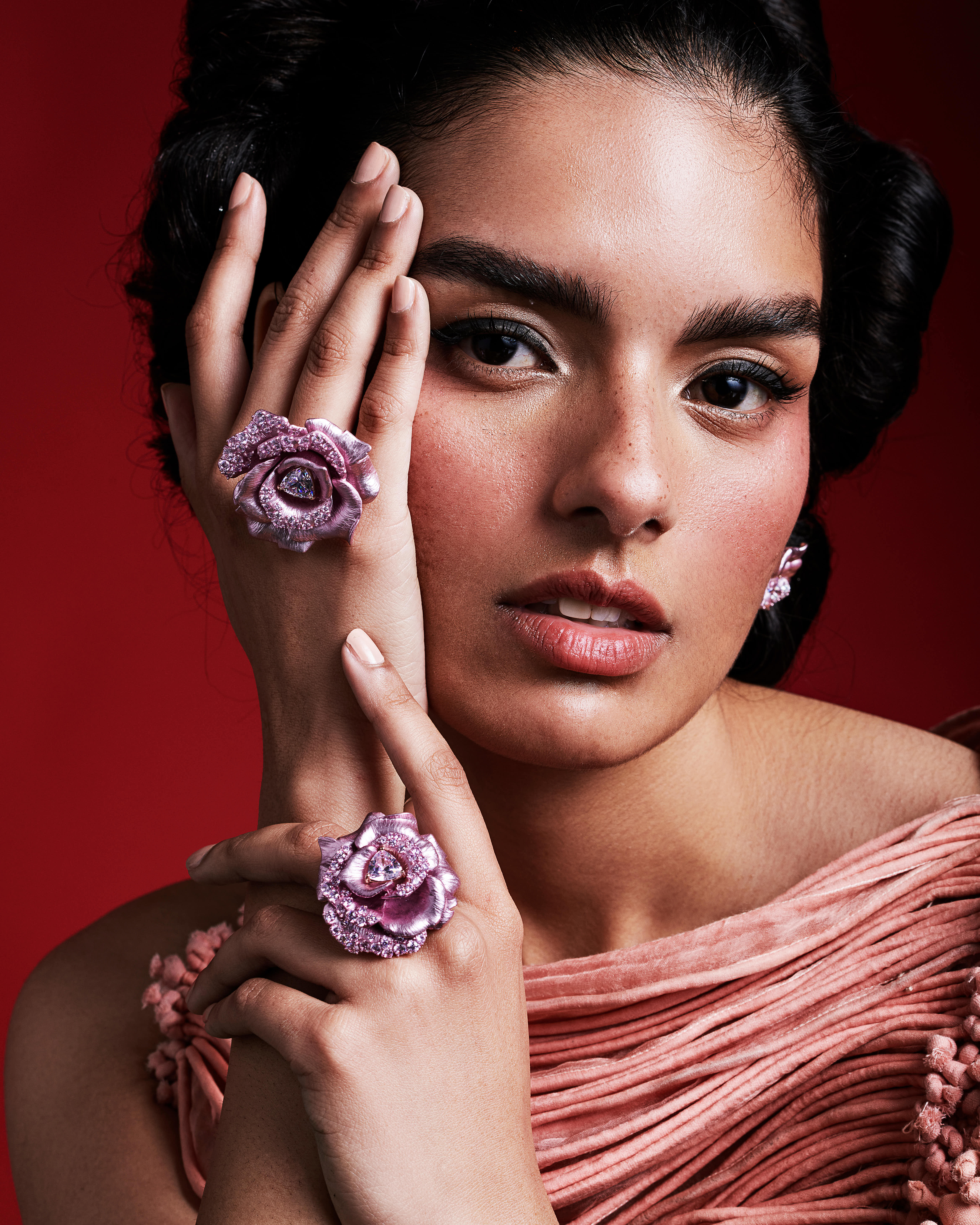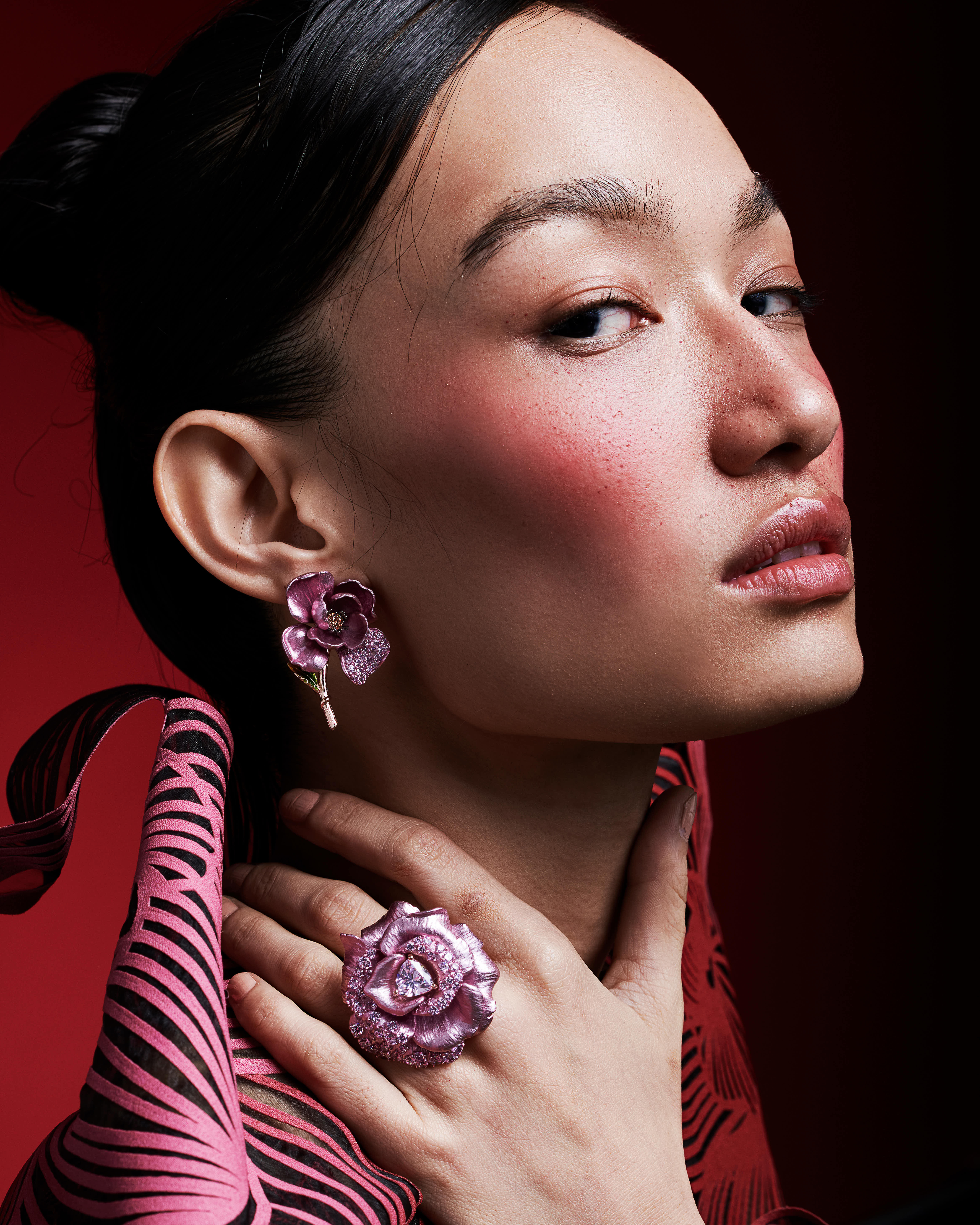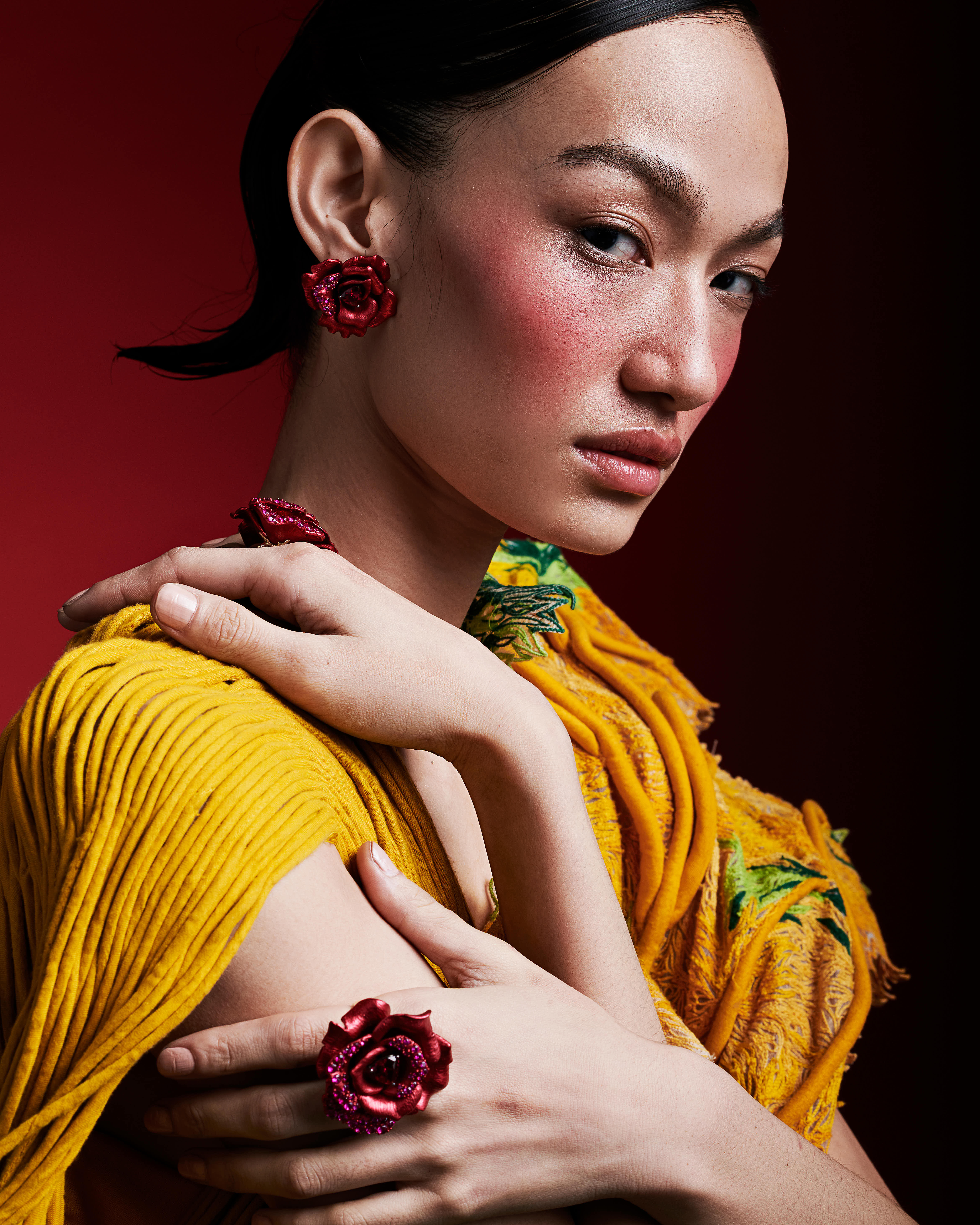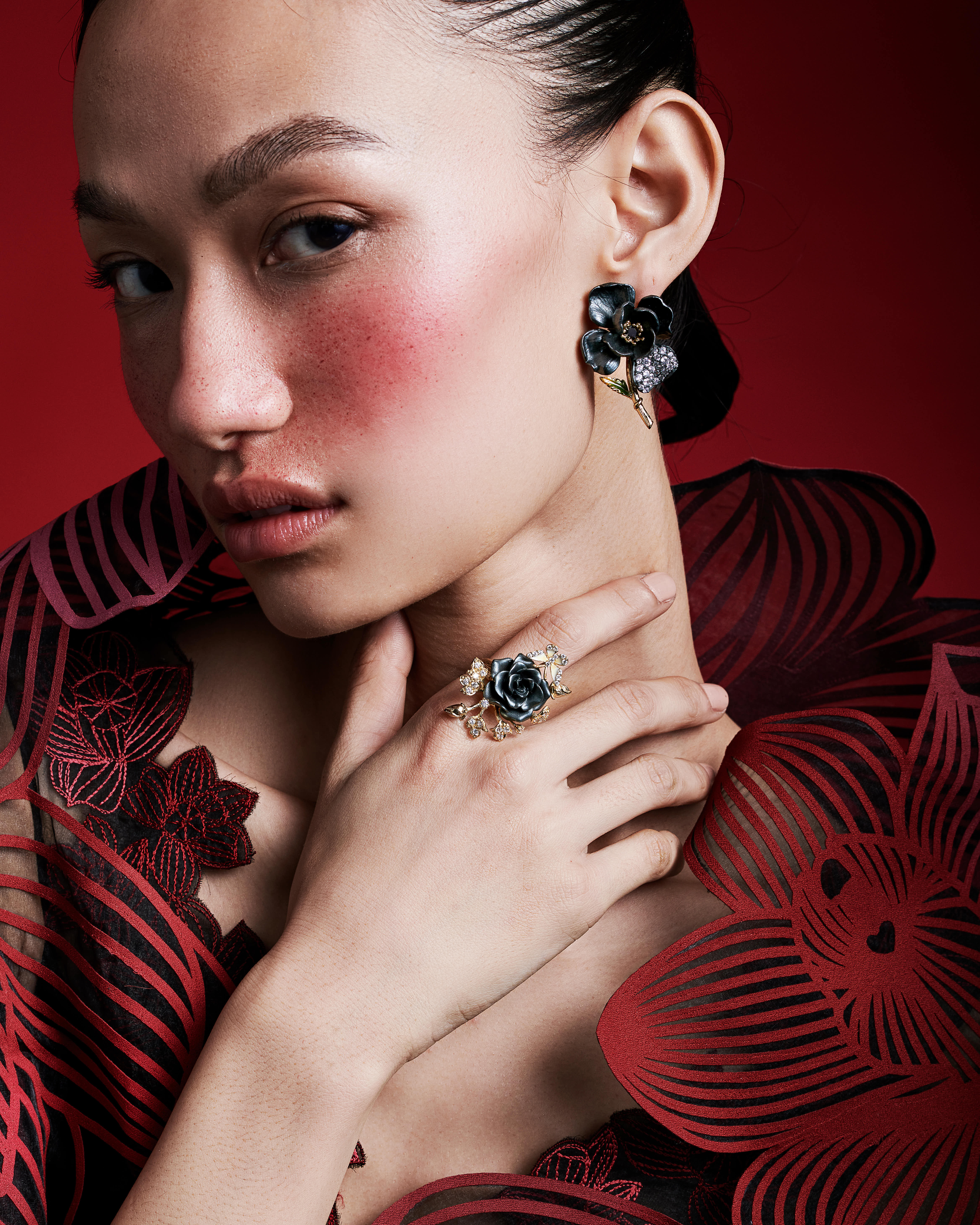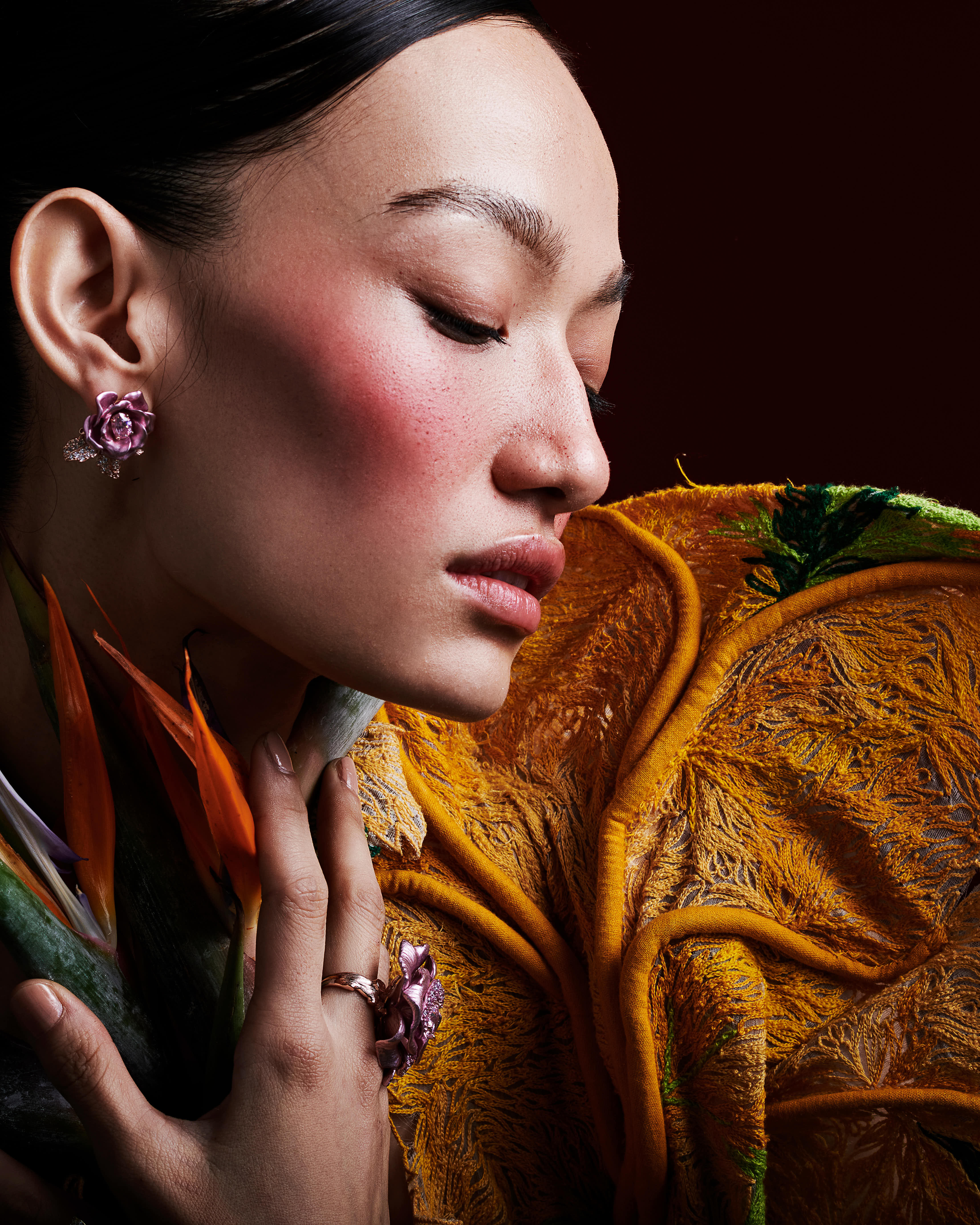 A surreal exploration of body and ornament. This shoot transforms floral jewelry into sculptural extensions of the self, styled with laser-cut forms and rich tones. Intimate, bold, and unapologetically expressive.