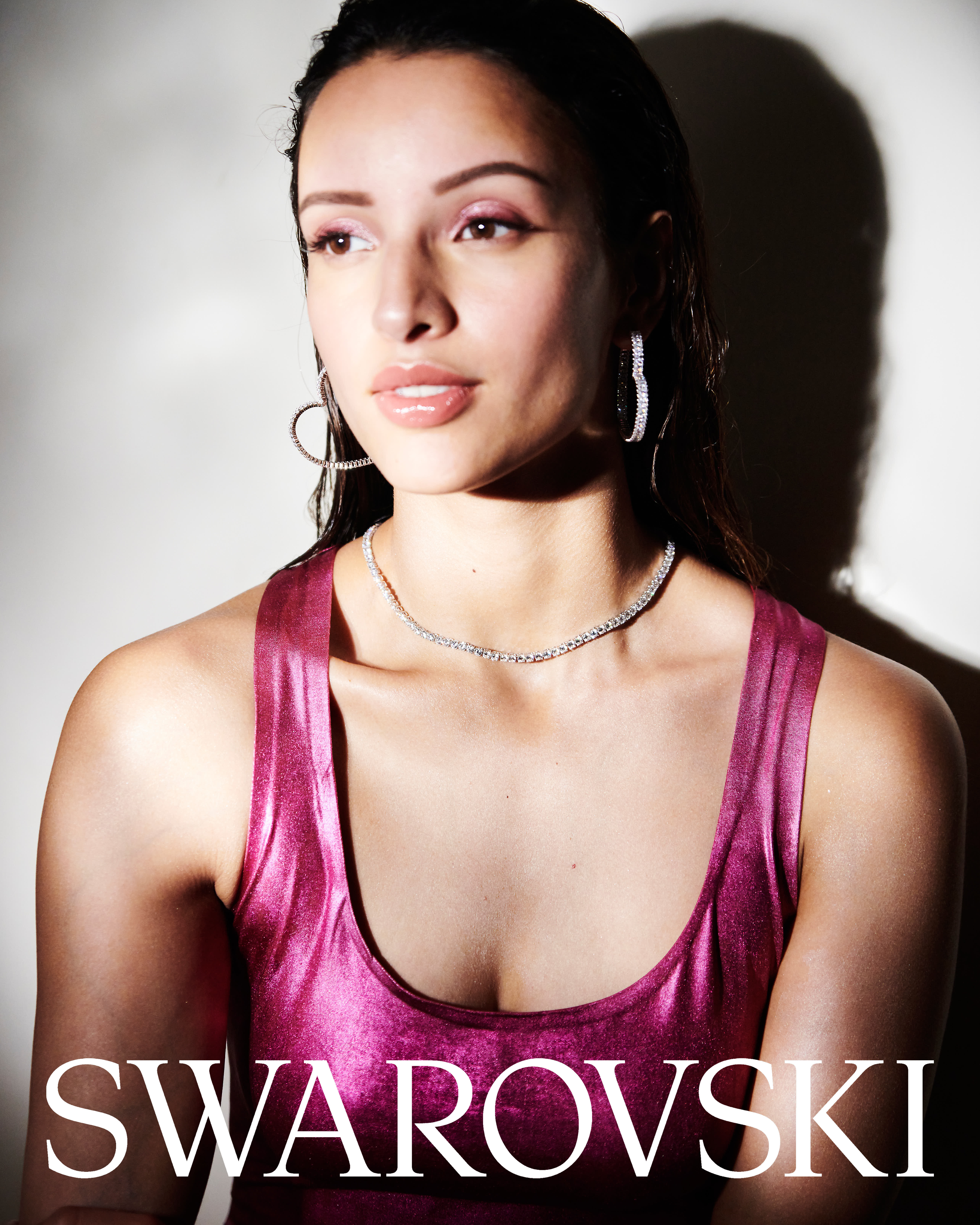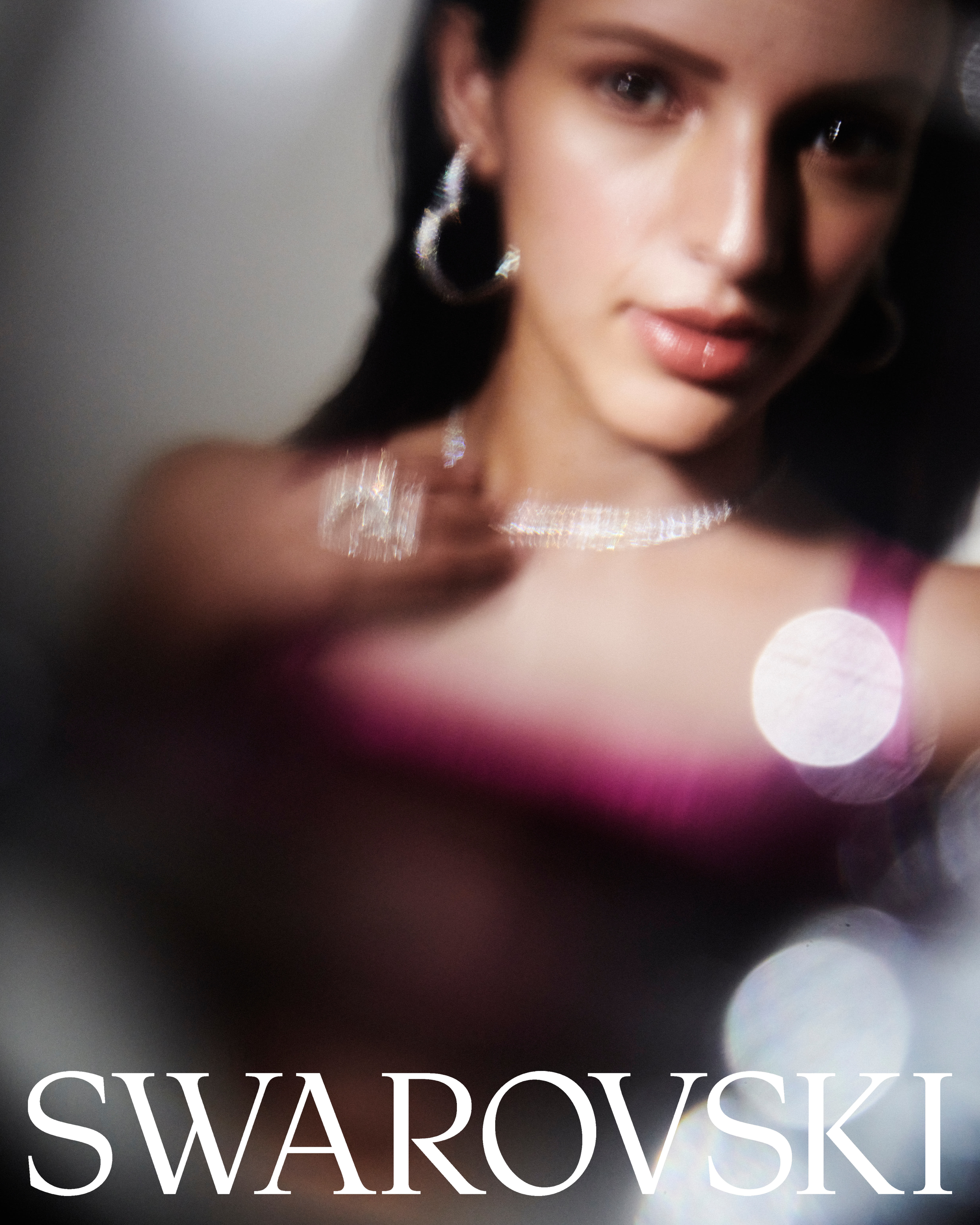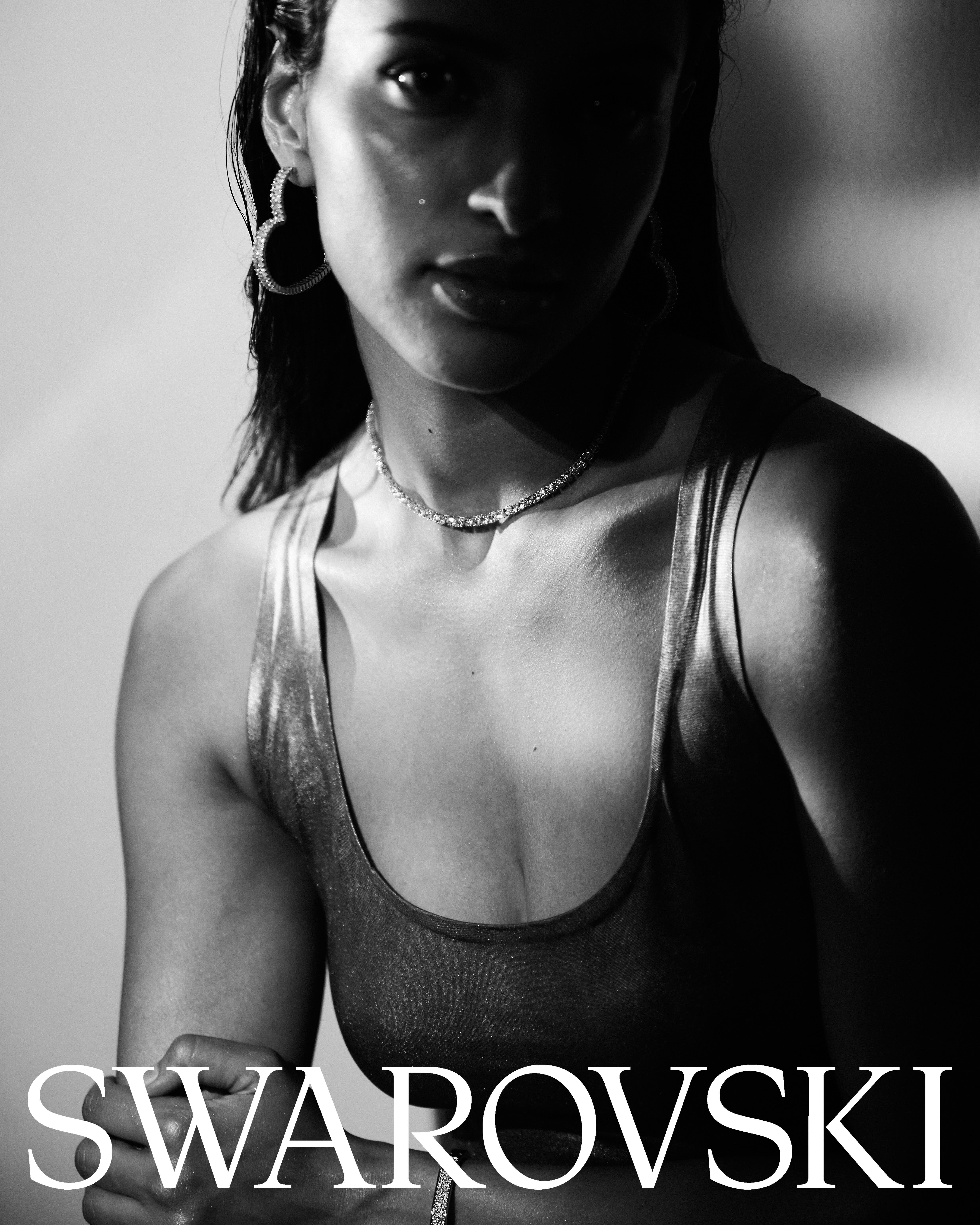 Bathed in gloss and shadow, she catches the light like crystal — effortless, radiant, untouchable. This Swarovski moment is less about sparkle and more about the glow of confidence, refracted in motion.